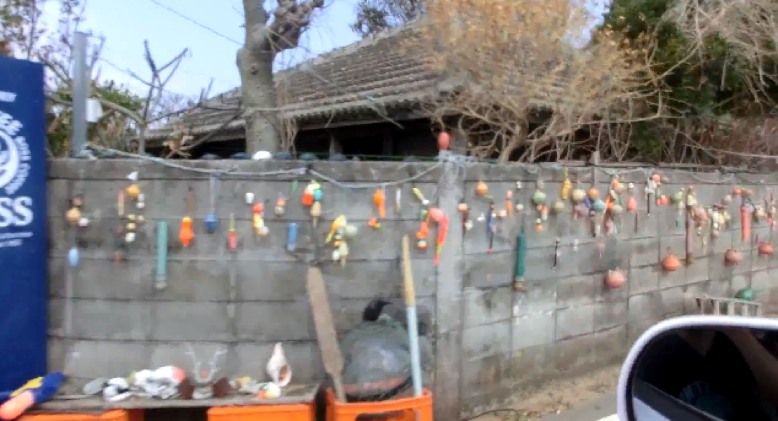 なんかおもしろい家がありました。たぶん海で拾った物を壁に吊るしてます!